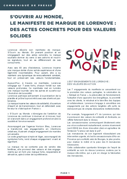 Industriels 03 juillet 2024 - 14:58 Lorenove dévoile son manifeste de marque: S’Ouvrir au Monde. En prenant position et en s’engageant sur des actes concrets, la marque souhaite donner du sens à ses actions et nourrir sa signature, tout en se différenciant de ses concurrents. PDF (3 Mo) Télécharger