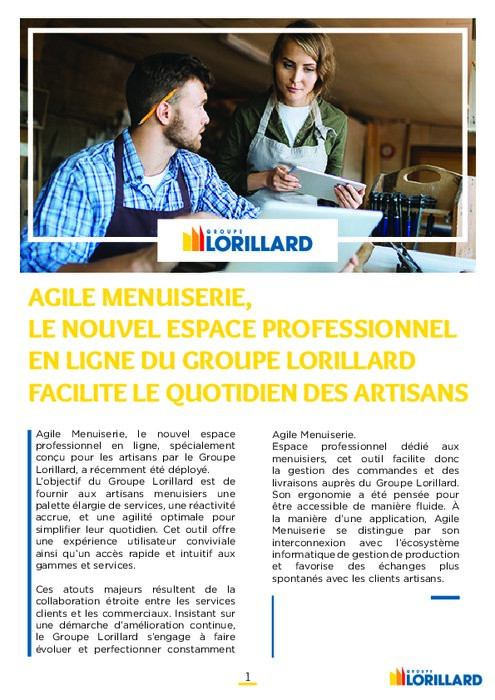 Agile Menuiserie, le nouvel espace professionnel en ligne, spécialement conçu pour les artisans par le Groupe Lorillard, a récemment été déployé. L’objectif du Groupe Lorillard est de fournir aux artisans menuisiers une palette élargie de services, une réactivité accrue, et une agilité optimale pour simplifier leur quotidien. Cet outil offre une expérience utilisateur conviviale ainsi qu’un accès rapide et intuitif aux gammes et services.