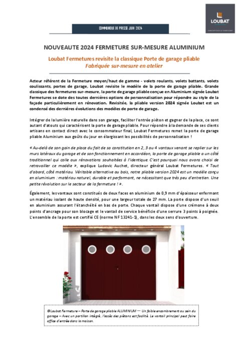 Acteur référent de la Fermeture moyen/haut de gamme - volets roulants, volets battants, volets coulissants, portes de garage, Loubat revisite le modèle de la porte de garage pliable. Grande classique des fermetures sur-mesure, la porte de garage pliable conçue en Aluminium signée Loubat Fermetures se dote des toutes dernières options de personnalisation pour répondre au style de la façade particulièrement en rénovation. Revisitée, la pliable version 2024 signée Loubat est un condensé des dernières évolutions des modèles de porte de garage.