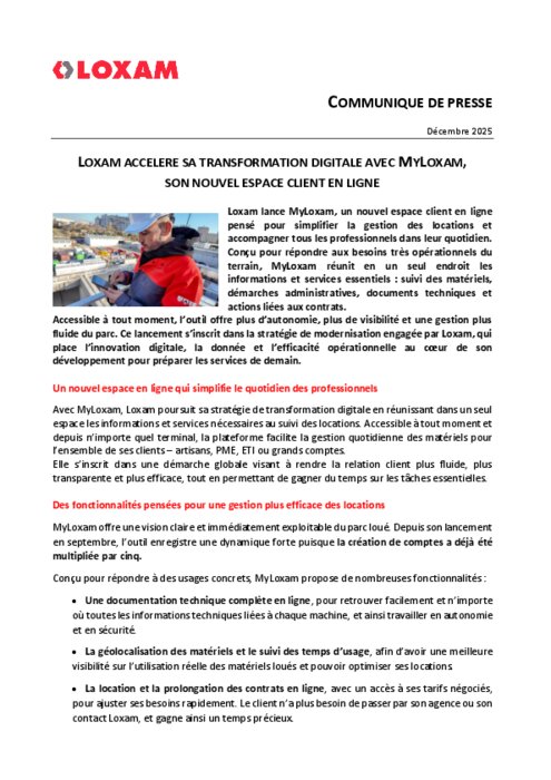 Loxam lance MyLoxam, un nouvel espace client en ligne pensé pour simplifier la gestion des locations et accompagner tous les professionnels dans leur quotidien. Conçu pour répondre aux besoins très opérationnels du terrain, MyLoxam réunit en un seul endroit les informations et services essentiels : suivi des matériels, démarches administratives, documents techniques et actions liées aux contrats.