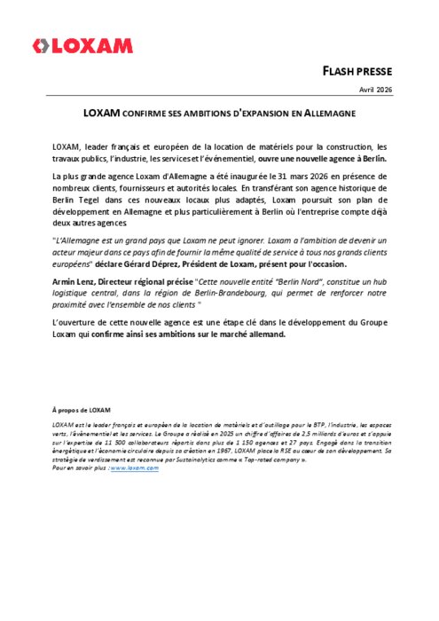 La plus grande agence Loxam d'Allemagne a été inaugurée le 31 mars 2026 en présence de nombreux clients, fournisseurs et autorités locales. En transférant son agence historique de Berlin Tegel dans ces nouveaux locaux plus adaptés, Loxam poursuit son plan de développement en Allemagne et plus particulièrement à Berlin où l'entreprise compte déjà deux autres agences.