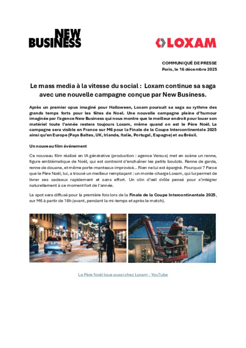 Après un premier opus imaginé pour Halloween, Loxam poursuit sa saga au rythme des grands temps forts pour les fêtes de Noël. Une nouvelle campagne pleine d’humour imaginée par l’agence New Business qui nous montre que le meilleur endroit pour louer son matériel toute l’année restera toujours Loxam, même quand on est le Père Noël. La campagne sera visible en France sur M6 pour la Finale de la Coupe Intercontinentale 2025 ainsi qu’en Europe (Pays Baltes, UK, Irlande, Italie, Portugal, Espagne) et au Brésil.