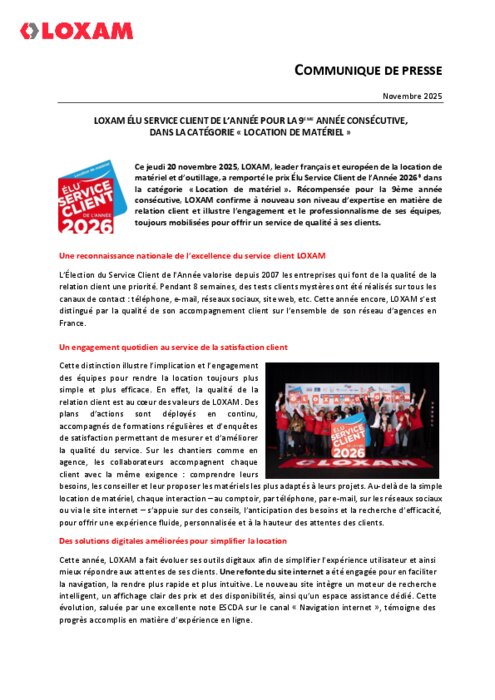 Loxam, leader français et européen de la location de matériel et d’outillage, a remporté le prix Élu Service Client de l’Année 2026 dans la catégorie « Location de matériel ». Récompensée pour la 9e année consécutive, Loxam confirme à nouveau son niveau d’expertise en matière de relation client et illustre l’engagement et le professionnalisme de ses équipes, toujours mobilisées pour offrir un service de qualité à ses clients.