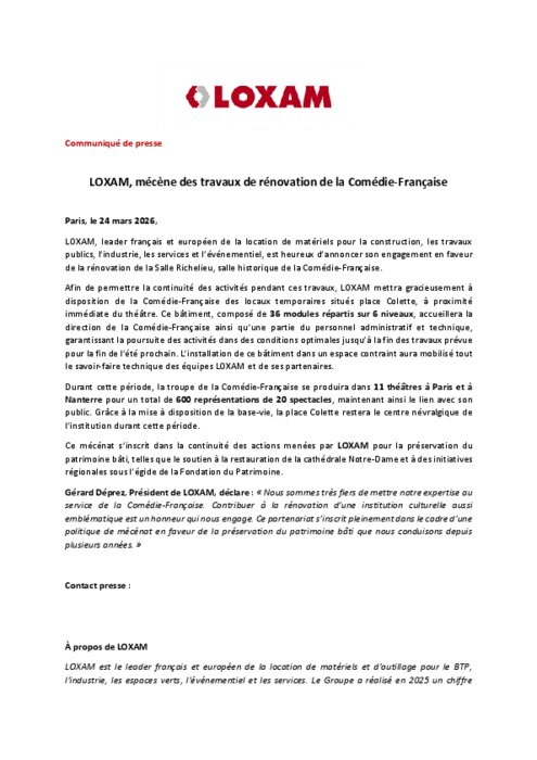 LOXAM, leader français et européen de la location de matériels pour la construction, les travaux publics, l’industrie, les services et l’événementiel, est heureux d’annoncer son engagement en faveur de la rénovation de la Salle Richelieu, salle historique de la Comédie-Française.