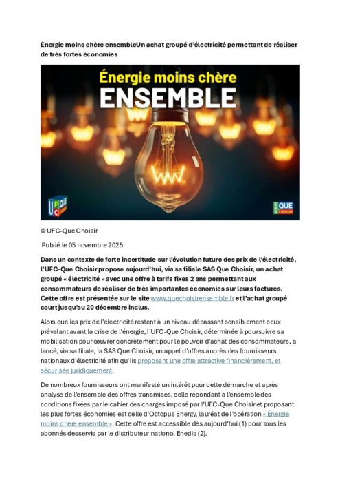 Dans un contexte de forte incertitude sur l’évolution future des prix de l’électricité, l’UFC-Que Choisir propose aujourd’hui, via sa filiale SAS Que Choisir, un achat groupé « électricité » avec une offre à tarifs fixes 2 ans permettant aux consommateurs de réaliser de très importantes économies sur leurs factures. Cette offre est présentée sur le site www.quechoisirensemble.fr et l’achat groupé court jusqu’au 20 décembre inclus.