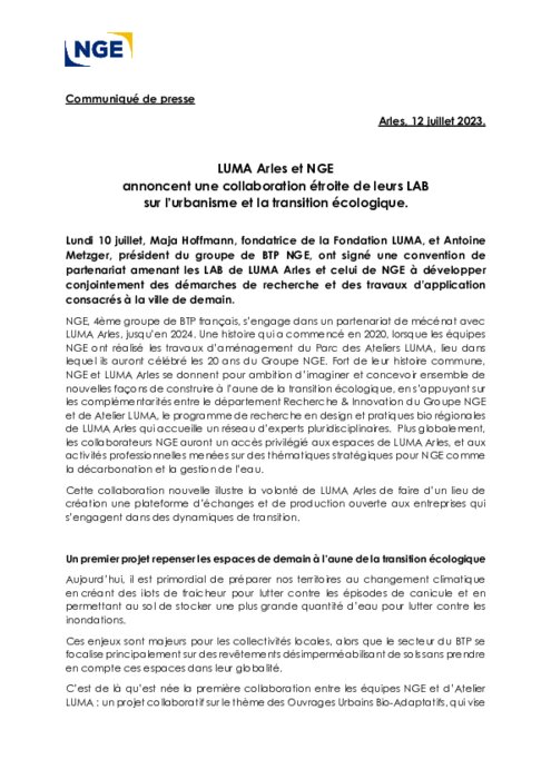 Lundi 10 juillet, Maja Hoffmann, fondatrice de la Fondation LUMA, et Antoine Metzger, président du groupe de BTP NGE, ont signé une convention de partenariat amenant les LAB de LUMA Arles et celui de NGE à développer conjointement des démarches de recherche et des travaux d’application consacrés à la ville de demain.