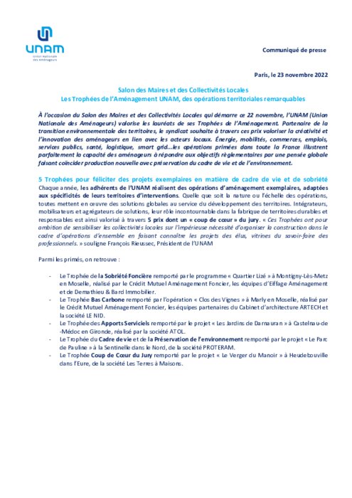 Chaque année, les adhérents de l’UNAM réalisent des opérations d’aménagement exemplaires, adaptées aux spécificités de leurs territoires d’interventions. Quelle que soit la nature ou l’échelle des opérations, toutes mettent en œuvre des solutions globales au service du développement des territoires. Intégrateurs, mobilisateurs et agrégateurs de solutions, leur rôle incontournable dans la fabrique de territoires durables et responsables est ainsi valorisé à travers 5 prix dont un « coup de cœur »