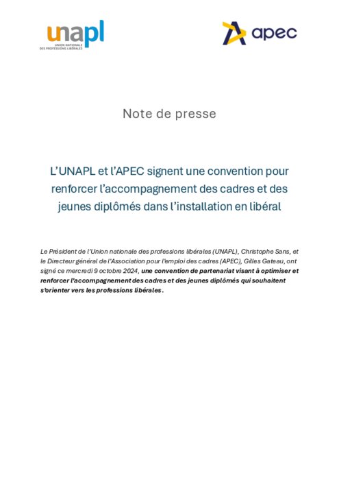 L’Union nationale des professions libérales (UNAPL) et l’Association pour l’emploi des cadres (Apec) se mobilisent, à travers la signature de ce partenariat, pour optimiser l’accompagnement des cadres et jeunes diplômés intéressés par les professions libérales, en particulier les cadres séniors et jeunes diplômés des quartiers prioritaires de la politique de la ville (QPV).