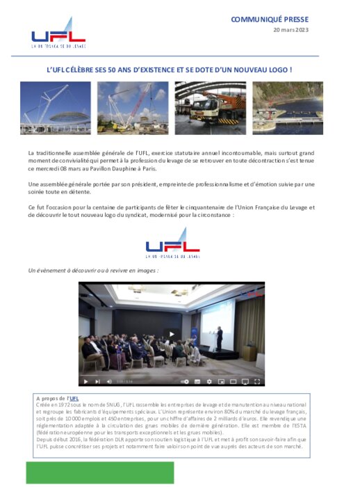 La traditionnelle assemblée générale de l’UFL, exercice statutaire annuel incontournable, mais surtout grand moment de convivialité qui permet à la profession du levage de se retrouver en toute décontraction s’est tenue ce mercredi 08 mars au Pavillon Dauphine à Paris. Ce fut l’occasion pour la centaine de participants de fêter le cinquantenaire de l’Union Française du Levage et de découvrir le tout nouveau logo du syndicat.