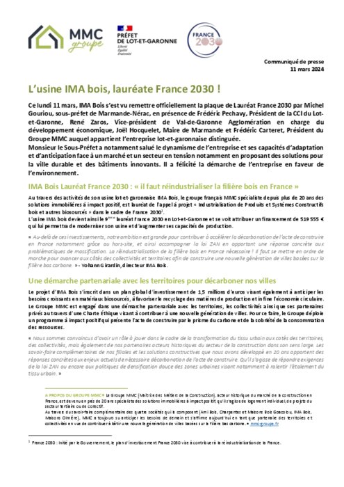 Ce lundi 11 mars, IMA Bois s’est vu remettre officiellement la plaque de Lauréat France 2030 par Michel Gouriou, sous-préfet de Marmande-Nérac, en présence de Frédéric Pechavy, Président de la CCI du Lot-et-Garonne, René Zaros, Vice-président de Val-de-Garonne Agglomération en charge du développement économique, Joël Hocquelet, Maire de Marmande et Frédéric Carteret, Président du Groupe MMC auquel appartient l’entreprise lot-et-garonnaise distinguée.