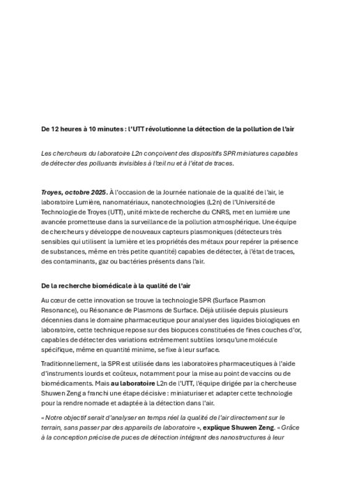 À l’occasion de la Journée nationale de la qualité de l’air, le laboratoire Lumière, nanomatériaux, nanotechnologies (L2n) de l’Université de Technologie de Troyes (UTT), unité mixte de recherche du CNRS, met en lumière une avancée prometteuse dans la surveillance de la pollution atmosphérique. Une équipe de chercheurs y développe de nouveaux capteurs plasmoniques (détecteurs très sensibles qui utilisent la lumière et les propriétés des métaux pour repérer la présence de substances, même en très petite quantité) capables de détecter, à l’état de traces, des contaminants, gaz ou bactéries présents dans l’air.