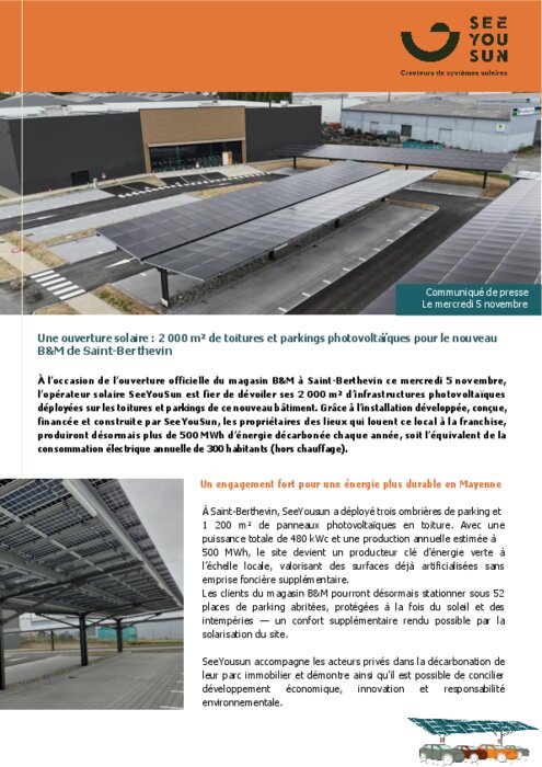 À l’occasion de l’ouverture officielle du magasin B et M à Saint-Berthevin le mercredi 5 novembre, l’opérateur solaire SeeYouSun est fier de dévoiler ses 2 000 m² d’infrastructures photovoltaïques déployées sur les toitures et parkings de ce nouveau bâtiment. Grâce à l’installation développée, conçue, financée et construite par SeeYouSun, les propriétaires des lieux qui louent ce local à la franchise, produiront désormais plus de 500 MWh d’énergie décarbonée chaque année, soit l’équivalent de la consommation électrique annuelle de 300 habitants (hors chauffage).