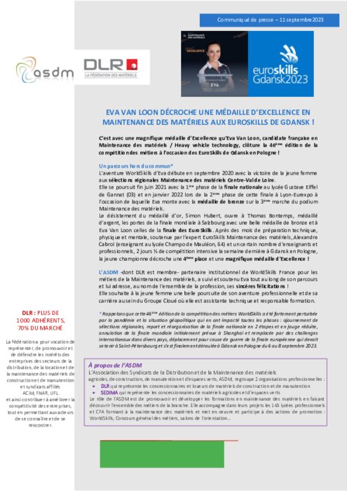C’est avec une magnifique médaille d’Excellence qu’Eva Van Loon, candidate française en Maintenance des matériels / Heavy vehicle technology, clôture la 46ème édition de la compétition des métiers à l’occasion des EuroSkills de Gdansk en Pologne.