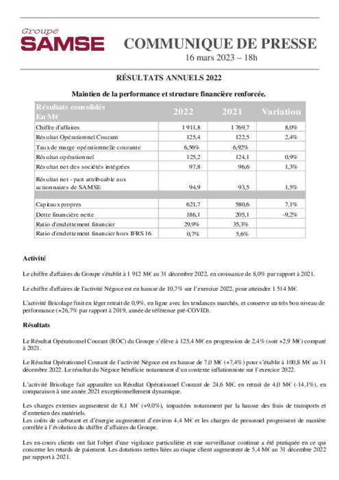 Maintien de la performance en 2023 pour Samse