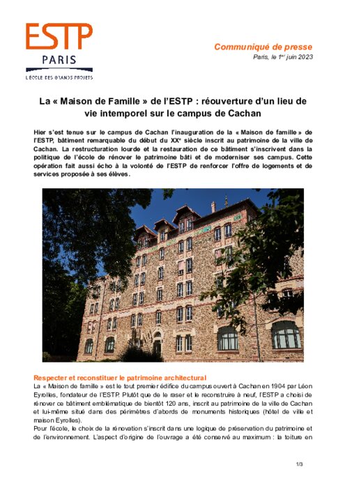 Hier s’est tenue sur le campus de Cachan l’inauguration de la « Maison de famille » de l’ESTP, bâtiment remarquable du début du XXe siècle inscrit au patrimoine de la ville de Cachan. La restructuration lourde et la restauration de ce bâtiment s’inscrivent dans la politique de l’école de rénover le patrimoine bâti et de moderniser ses campus. Cette opération fait aussi écho à la volonté de l’ESTP de renforcer l’offre de logements et de services proposée à ses élèves.