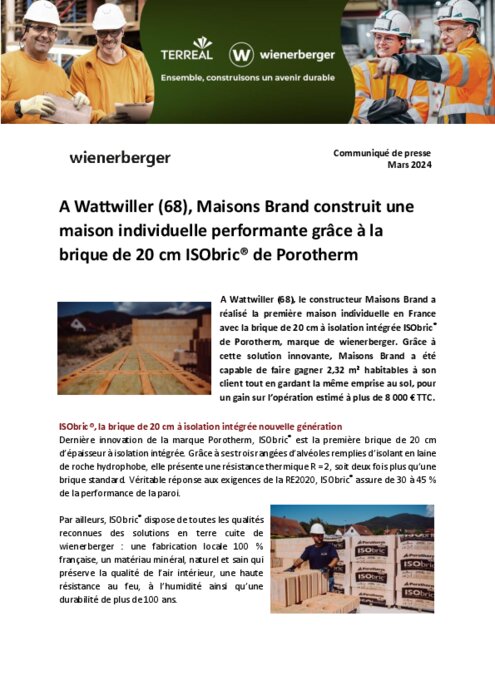 A Wattwiller (68), le constructeur Maisons Brand a réalisé la première maison individuelle en France avec la brique de 20 cm à isolation intégrée ISObric de Porotherm, marque de wienerberger. Grâce à cette solution innovante, Maisons Brand a été capable de faire gagner 2,32 m2 habitables à son client tout en gardant la même emprise au sol, pour un gain sur l’opération estimé à plus de 8 000 € TTC.