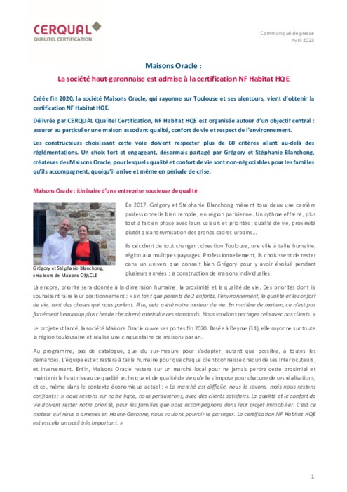 Créée fin 2020, la société Maisons Oracle, qui rayonne sur Toulouse et ses alentours, vient d’obtenir la certification NF Habitat HQE. Délivrée par Cerqual Qualitel Certification, NF Habitat HQE est organisée autour d’un objectif central : assurer au particulier une maison associant qualité, confort de vie et respect de l’environnement.