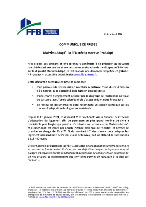 Afin d’aider ses artisans et entrepreneurs adhérents à se préparer au nouveau marché destiné aux seniors et aux personnes en situation de handicap et à s’informer sur le dispositif MaPrimeAdapt’, la FFB propose une démarche simplifiée et gratuite, « ProAdapt », accessible depuis le site www.ffbatiment.fr.