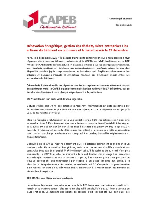 À la suite d’une large consultation qui a reçu plus de 5 000 réponses d’artisans du bâtiment adhérents à la Capeb sur MaPrimeRénov’ et la REP PMCB, la Capeb alerte sur une situation devenue critique pour les entreprises artisanales. Les résultats mettent en évidence un mécontentement profond, alimenté par des dispositifs publics jugés trop complexes et instables, qui fragilisent directement les artisans et auxquels s’ajoute la crispation générée par l’inéquité fiscale entre les entreprises du bâtiment.