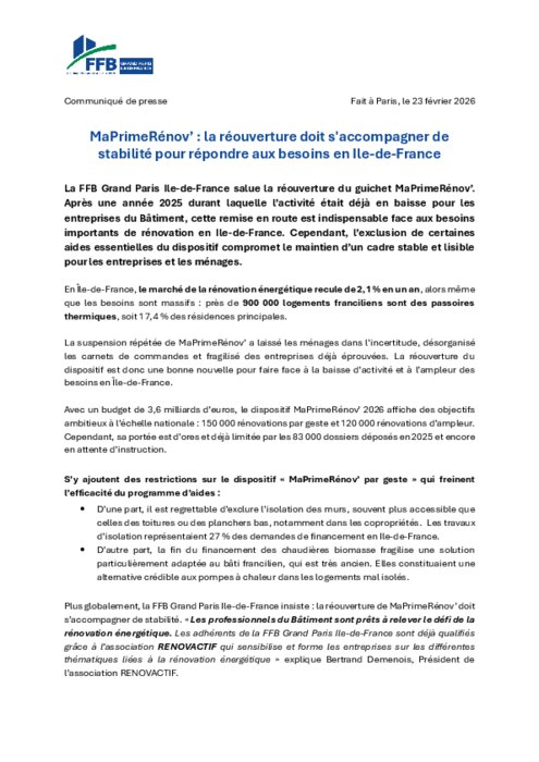 La FFB Grand Paris Ile-de-France salue la réouverture du guichet MaPrimeRénov’. Après une année 2025 durant laquelle l’activité était déjà en baisse pour les entreprises du Bâtiment, cette remise en route est indispensable face aux besoins importants de rénovation en Ile-de-France. Cependant, l’exclusion de certaines aides essentielles du dispositif compromet le maintien d’un cadre stable et lisible pour les entreprises et les ménages.