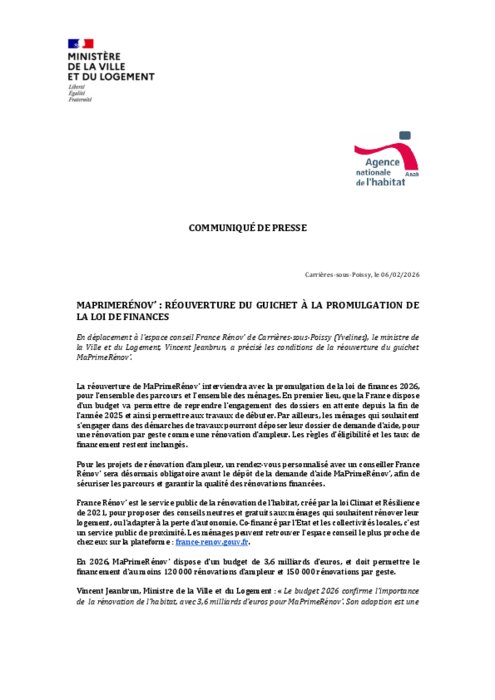 Institutionnels 09 février 2026 - 11:51 En déplacement à l’espace conseil France Rénov’ de Carrières-sous-Poissy (Yvelines), le ministre de la Ville et du Logement, Vincent Jeanbrun, a précisé les conditions de la réouverture du guichet MaPrimeRénov’. PDF (263 Ko) Télécharger © Anah