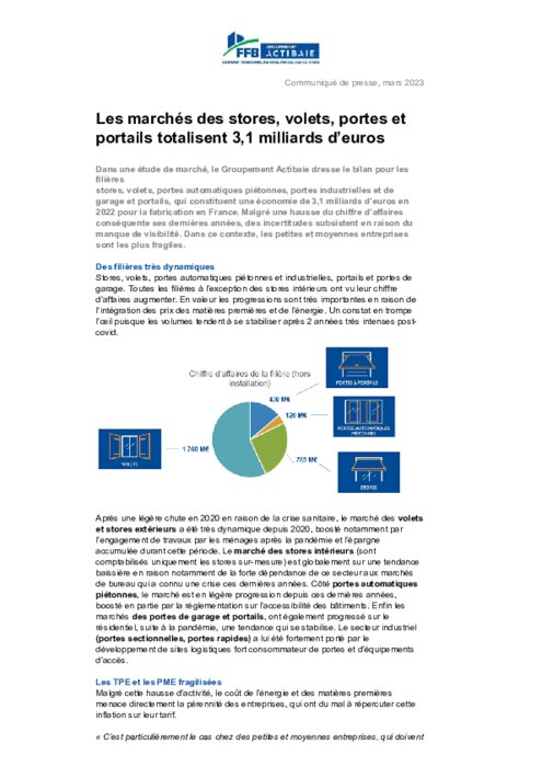 Dans une étude de marché, le Groupement Actibaie dresse le bilan pour les filières stores, volets, portes automatiques piétonnes, portes industrielles et de garage et portails, qui constituent une économie de 3,1 milliards d’euros en 2022 pour la fabrication en France. Malgré une hausse du chiffre d’affaires conséquente ses dernières années, des incertitudes subsistent en raison du manque de visibilité. Dans ce contexte, les petites et moyennes entreprises sont les plus fragiles.