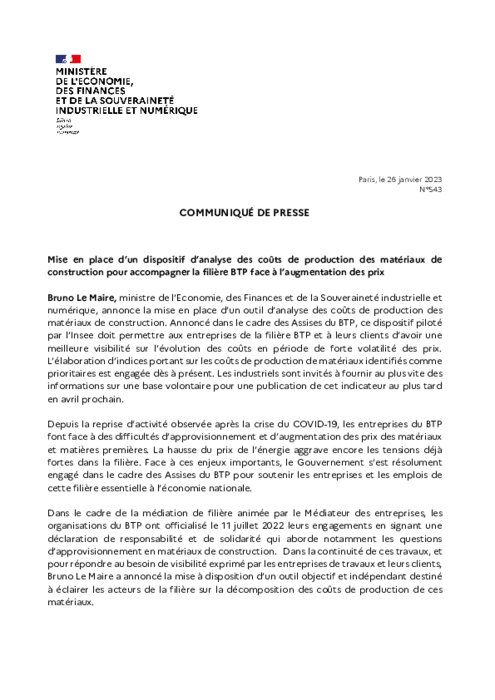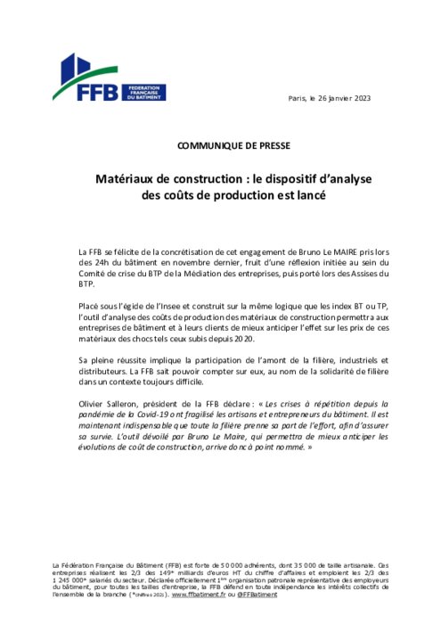 La FFB se félicite de la concrétisation de cet engagement de Bruno Le MAIRE pris lors des 24h du bâtiment en novembre dernier, fruit d’une réflexion initiée au sein du Comité de crise du BTP de la Médiation des entreprises, puis porté lors des Assises du BTP.