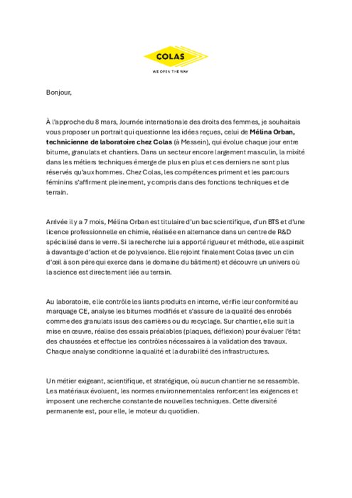 À l’approche du 8 mars, Journée internationale des droits des femmes, je souhaitais vous proposer un portrait qui questionne les idées reçues, celui de Mélina Orban, technicienne de laboratoire chez Colas (à Messein), qui évolue chaque jour entre bitume, granulats et chantiers. Dans un secteur encore largement masculin, la mixité dans les métiers techniques émerge de plus en plus et ces derniers ne sont plus réservés qu’aux hommes. Chez Colas, les compétences priment et les parcours féminins s’affirment pleinement, y compris dans des fonctions techniques et de terrain.