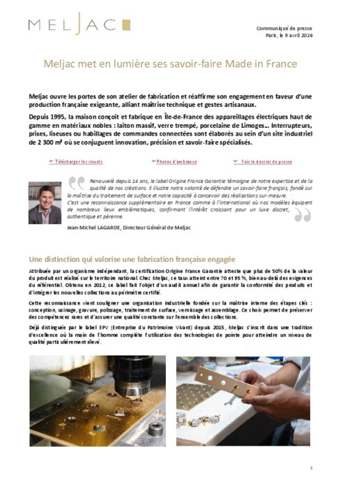 Meljac ouvre les portes de son atelier de fabrication et réaffirme son engagement en faveur d’une production française exigeante, alliant maîtrise technique et gestes artisanaux. Depuis 1995, la maison conçoit et fabrique en Île-de-France des appareillages électriques haut de gamme en matériaux nobles : laiton massif, verre trempé, porcelaine de Limoges… Interrupteurs, prises, liseuses ou habillages de commandes connectées sont élaborés au sein d’un site industriel de 2 300 m² où se conjuguent innovation, précision et savoir-faire spécialisés.