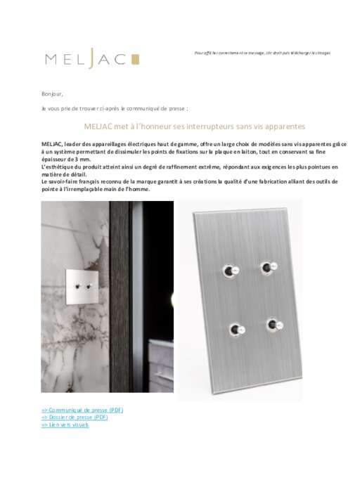 MELJAC, leader des appareillages électriques haut de gamme, offre un large choix de modèles sans vis apparentes grâce à un système permettant de dissimuler les points de fixations sur la plaque en laiton, tout en conservant sa fine épaisseur de 3 mm.