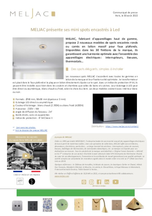 Meljac, fabricant d’appareillages haut de gamme, propose 2 nouveaux modèles de spots encastrés ronds ou carrés en laiton massif pour faux plafonds. Disponibles dans les 30 finitions de la marque, ils