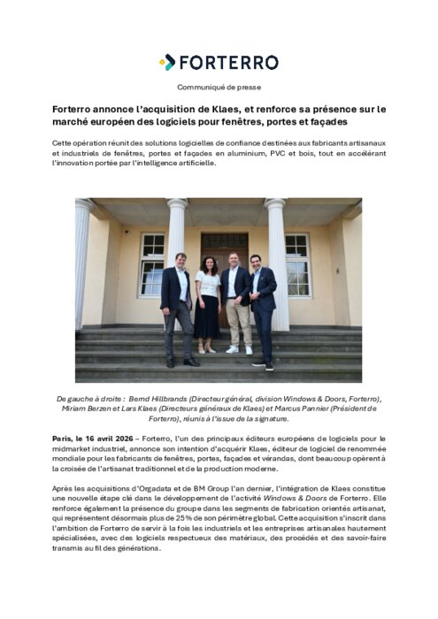Services 20 avril 2026 - 11:30 Cette opération réunit des solutions logicielles de confiance destinées aux fabricants artisanaux et industriels de fenêtres, portes et façades en aluminium, PVC et bois, tout en accélérant l’innovation portée par l’intelligence artificielle. PDF (2 Mo) Télécharger FORTERRO