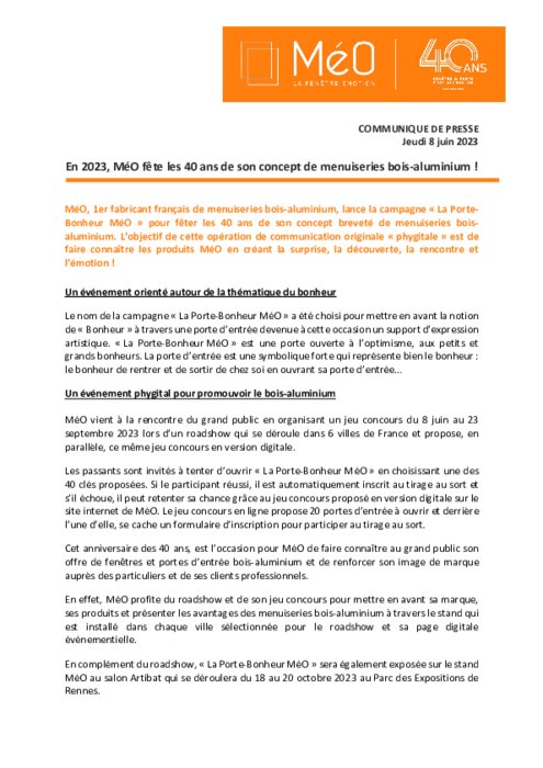 MéO, 1er fabricant français de menuiseries bois-aluminium, lance la campagne « La Porte-Bonheur MéO » pour fêter les 40 ans de son concept breveté de menuiseries bois-aluminium. L’objectif de cette opération de communication originale « phygitale » est de faire connaître les produits MéO en créant la surprise, la découverte, la rencontre et l’émotion.