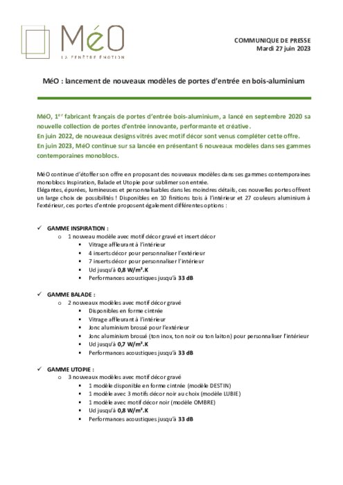 MéO, 1er fabricant français de portes d’entrée bois-aluminium, a lancé en septembre 2020 sa nouvelle collection de portes d’entrée innovante, performante et créative. En juin 2022, de nouveaux designs vitrés avec motif décor sont venus compléter cette offre. En juin 2023, MéO continue sur sa lancée en présentant 6 nouveaux modèles dans ses gammes contemporaines monoblocs.