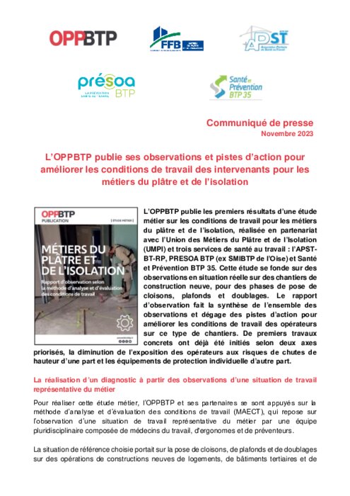 L’OPPBTP publie les premiers résultats d’une étude métier sur les conditions de travail pour les métiers du plâtre et de l’isolation, réalisée en partenariat avec l’Union des Métiers du Plâtre et de l’Isolation (UMPI) et trois services de santé au travail : l’APST-BT-RP, PRESOA BTP (ex SMIBTP de l’Oise) et Santé et Prévention BTP 35.