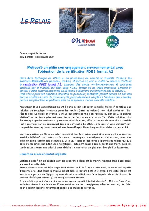 Sous Avis Technique du CSTB et en possession de nombreux résultats d'essais, les solutions Métisse - en panneau, rouleau, et flocons en vrac à souffler – viennent d’obtenir la certification FDES format A2, assurant des atouts environnementaux et sanitaires attendus sur le marché. En effet cette FDES atteste de sa faible empreinte carbone et