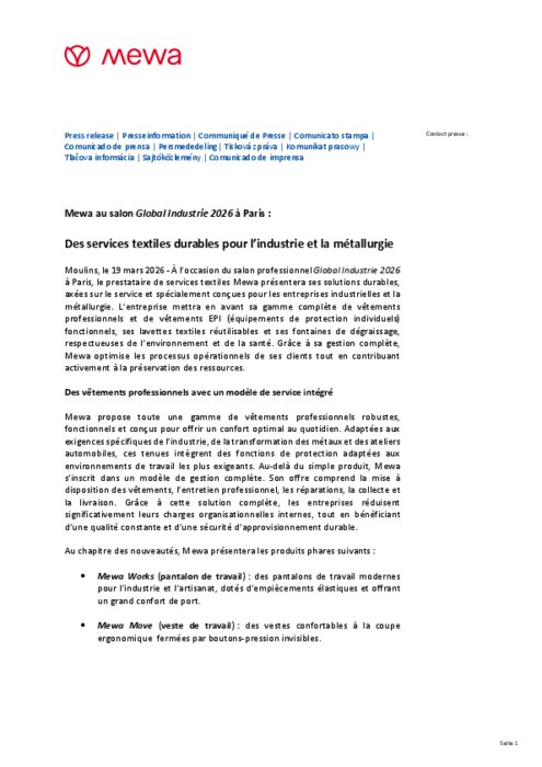 À l’occasion du salon professionnel Global Industrie 2026 à Paris, le prestataire de services textiles Mewa présentera ses solutions durables, axées sur le service et spécialement conçues pour les entreprises industrielles et la métallurgie. L’entreprise mettra en avant sa gamme complète de vêtements professionnels et de vêtements EPI (équipements de protection individuels) fonctionnels, ses lavettes textiles réutilisables et ses fontaines de dégraissage, respectueuses de l’environnement et de la santé.