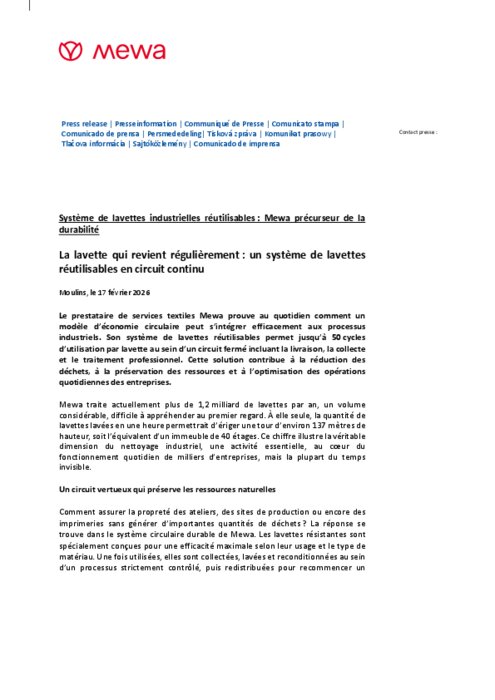 Le prestataire de services textiles Mewa prouve au quotidien comment un modèle d’économie circulaire peut s’intégrer efficacement aux processus industriels. Son système de lavettes réutilisables permet jusqu’à 50 cycles d’utilisation par lavette au sein d’un circuit fermé incluant la livraison, la collecte et le traitement professionnel. Cette solution contribue à la réduction des déchets, à la préservation des ressources et à l’optimisation des opérations quotidiennes des entreprises.
