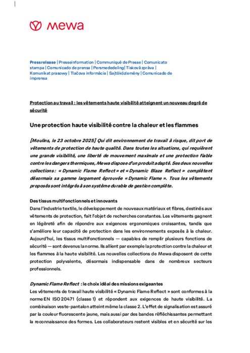 Qui dit environnement de travail à risque, dit port de vêtements de protection de haute qualité. Dans toutes les situations, qui requièrent une grande visibilité, une liberté de mouvement maximale et une protection fiable contre les dangers thermiques, Mewa dispose d’un produit adapté. Ses deux nouvelles collections : « Dynamic Flame Reflect » et « Dynamic Blaze Reflect »complètent désormais sa gamme largement éprouvée « Dynamic Flame ». Tous les vêtements proposés sont intégrés à son système durable de gestion complète.