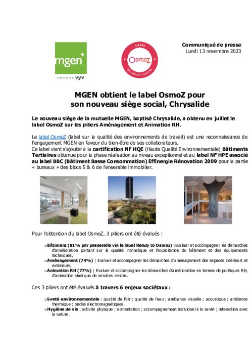Le nouveau siège de la mutuelle MGEN, baptisé Chrysalide, a obtenu en juillet le label OsmoZ sur les piliers Aménagement et Animation RH. Le label OsmoZ (label sur la qualité des environnements de travail) est une reconnaissance de l'engagement MGEN en faveur du bien-être de ses collaborateurs.