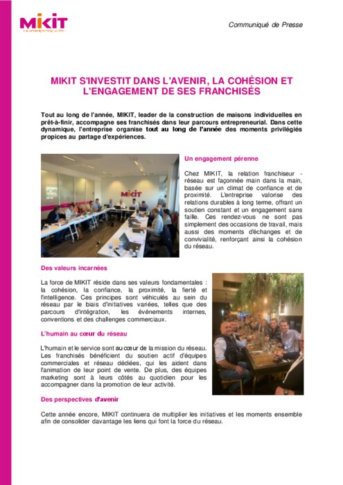 Tout au long de l'année, MIKIT, leader de la construction de maisons individuelles en prêt-à-finir, accompagne ses franchisés dans leur parcours entrepreneurial. Dans cette dynamique, l'entreprise organise tout au long de l’année des moments privilégiés propices au partage d'expériences.