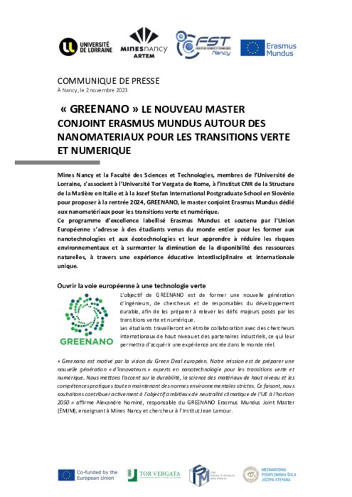 Mines Nancy et la Faculté des Sciences et Technologies, membres de l’Université de Lorraine, s’associent à l’Université Tor Vergata de Rome, à l’Institut CNR de la Structure de la Matière en Italie et à la Jozef Stefan International Postgraduate School en Slovénie pour proposer à la rentrée 2024, GREENANO, le master conjoint Erasmus Mundus dédié aux nanomatériaux pour les transitions verte et numérique.