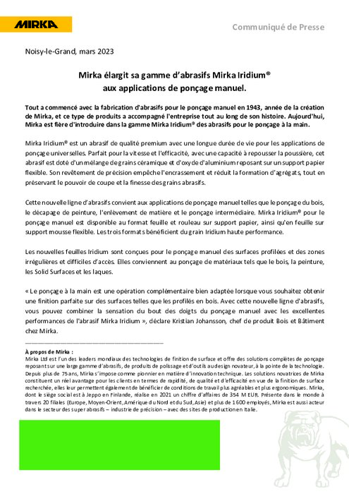 Mirka est fière d'introduire dans la gamme Mirka Iridium des abrasifs pour le ponçage à la main.