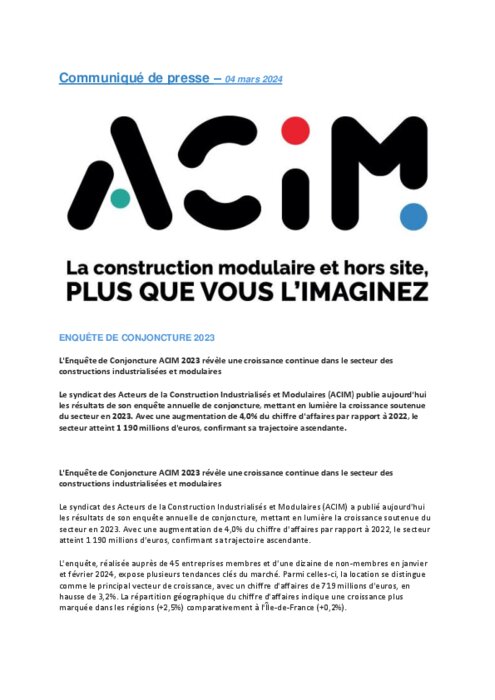 Le syndicat des Acteurs de la Construction Industrialisés et Modulaires (ACIM) publie aujourd'hui les résultats de son enquête annuelle de conjoncture, mettant en lumière la croissance soutenue du secteur en 2023. Avec une augmentation de +4 % du chiffre d'affaires par rapport à 2022, le secteur atteint 1 190 M€, confirmant sa trajectoire ascendante.