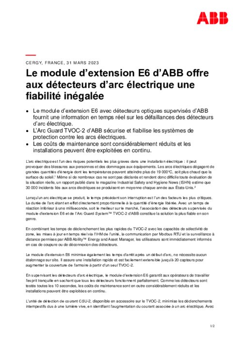 Le module d’extension E6 avec détecteurs optiques supervisés d’ABB fournit une information en temps réel sur les défaillances des détecteurs d’arc électrique. L’Arc Guard TVOC-2 d’ABB sécurise et fiabilise les systèmes de protection contre les arcs électriques. Les coûts de maintenance sont considérablement réduits et les installations peuvent être exploitées en continu.