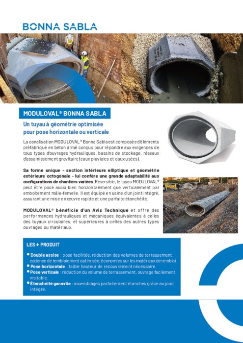 La canalisation Moduloval Bonna Sabla est composée d’éléments préfabriqué en béton armé conçus pour répondre aux exigences de tous types d’ouvrages hydrauliques, bassins de stockage, réseaux d’assainissement gravitaire (eaux pluviales et eaux usées).