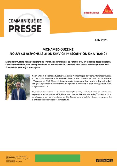 Mohamed Ouzzine vient d’intégrer Sika France, leader mondial de l’étanchéité, en tant que Responsable du Service Prescription, sous la responsabilité de Michèle Duval, Directrice Pôle Ventes directes (Bétons, Sols, Étanchéités, Toiture) & Prescription.