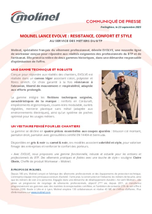 Molinel, spécialiste français du vêtement professionnel, dévoile EVOLVE, une nouvelle ligne de workwear conçue pour répondre aux réalités exigeantes des professionnels du BTP et de l’artisanat. Elle prend la relève de deux gammes historiques, dans une démarche responsable d’optimisation de l’offre.