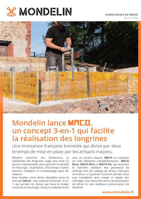 Élément essentiel des fondations, la réalisation des longrines exige une mise en œuvre irréprochable pour garantir la qualité de l’ouvrage. Cependant, cette étape s’avère souvent complexe et chronophage pour les maçons. Pour faciliter cette tâche, Mondelin lance le concept MACO : une solution brevetée, 3-en1, qui permet de diviser par deux le temps consacré à cette étape.
