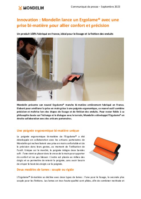 Mondelin présente son nouvel Ergolame manche bi-matière entièrement fabriqué en France. Elaboré pour améliorer la prise en main grâce à une poignée ergonomique, ce nouvel outil combine précision et maîtrise lors des étapes de lissage et de finition des enduits. Pour rester fidèle à sa philosophie basée sur l’échange et le dialogue avec le terrain, Mondelin a développé l’Ergolame en étroite collaboration avec des artisans partenaires.